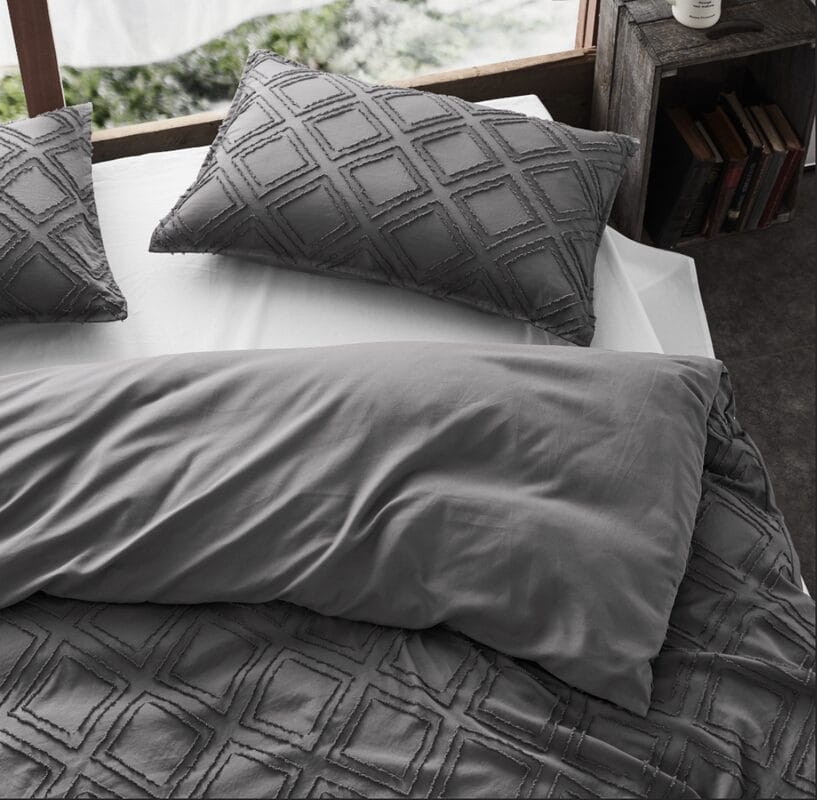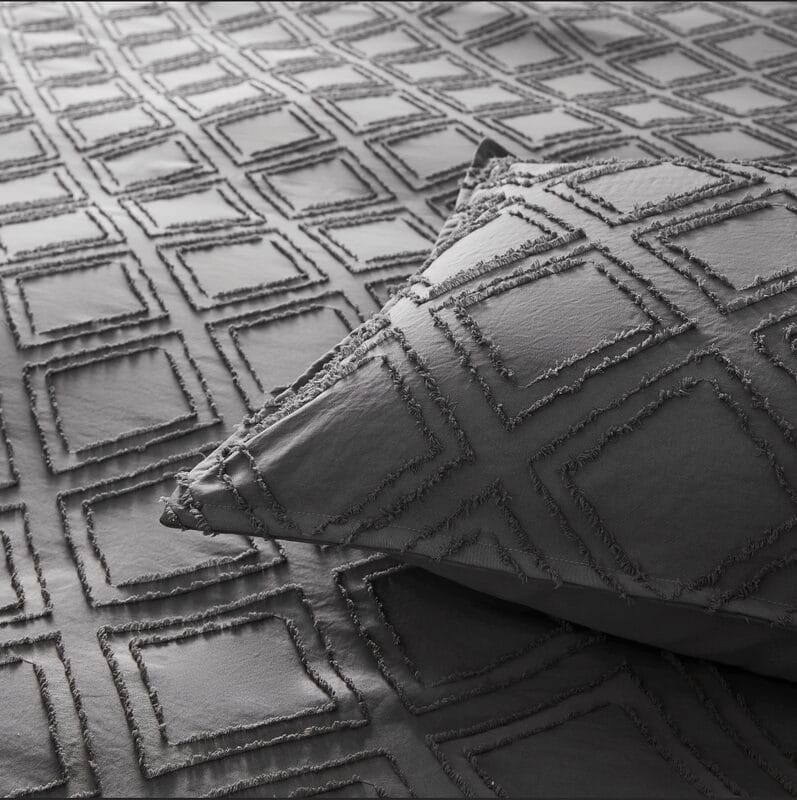 Front is tufted microfiber, reverse is brushed microfiber, Comes with 1 king size quilt cover 245x210cm & 2 pillowcases 48x73cm,machine washable, zipper closure,